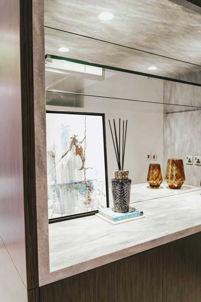 اخترنا التصميم المودرن والألوان الموحده للمكان واستخدمنا للجدران خشب السنديان بالإضافة إلى ورق جدران من درجات الرمادي والرخام الأونيكس المضيء بدلاً من المصابيح الجدارية.